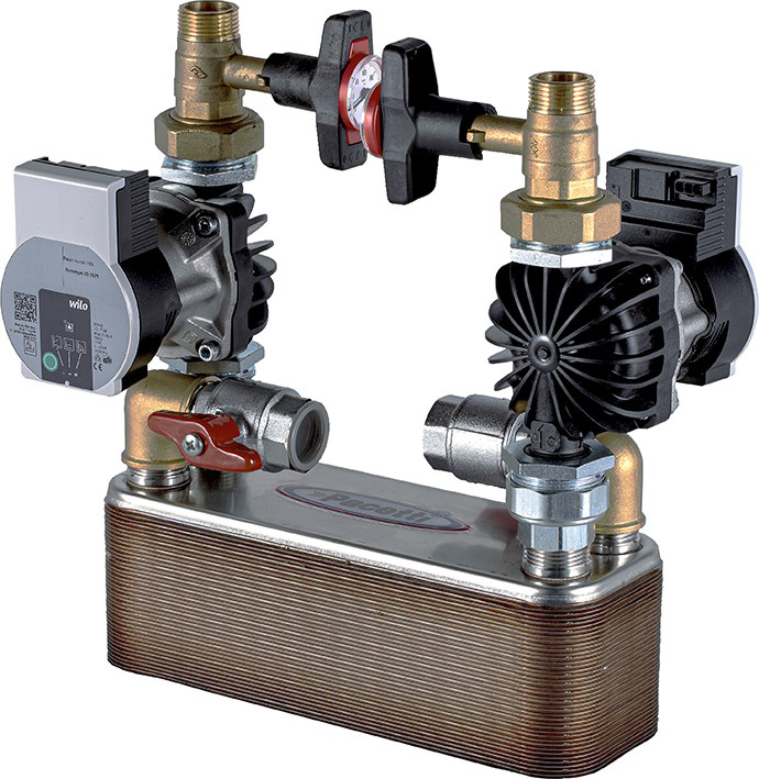 Corredati di scambiatore di calore a piastre saldobrasato BV 26, circolatori elettronici programmabili, termometri, valvole di intercettazione e ritegno.