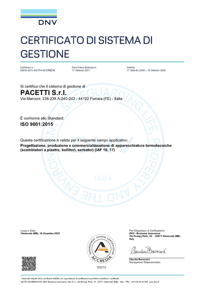 La certificazione di conformità alla Direttiva PED 2014/68/UE, allegato III modulo D1, garantisce la qualità del processo di produzione ed il rispetto dei requisiti essenziali di sicurezza, permettendo l’immissione sul mercato di scambiatori marcati CE, idonei ad essere installati anche in applicazioni con pressioni di esercizio elevate.
